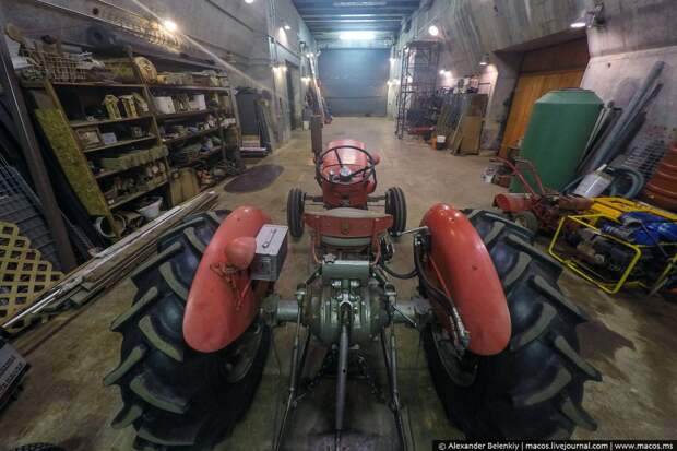 13 Проходим через ещё одну гермодверь, и оказываемся в узкой и длинной комнате. Тут у Эда гараж: газонокосилка, дизель-генератор и старый трактор. Как раз на его месте, раньше была “припаркована” ядерная боеголовка. Вот прямо в этой комнате.