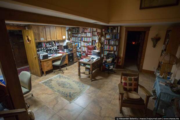 23 Офис и библиотека. Наверное, самое время рассказать, чем Эдвард Пидэн зарабатывает на жизнь. После того, как они с женой купили этот военный объект, перестроили в жилой дом и стали в нём жить, они начали собственный бизнес по продаже подобных объектов недвижимости. Вам кажется, что больше на свете не найдётся идиотов, желающих жить в подземном бункере? Как бы ни так: за 18 лет они закрыли больше 60 сделок по купле-продаже всевозможных ядерных объектов, выведенных из строя. Люди покупают такую недвижимость по разным причинам. Кто-то в самом деле боится атаки зомби или пришельцев, кому-то хочется оригинальный дом.