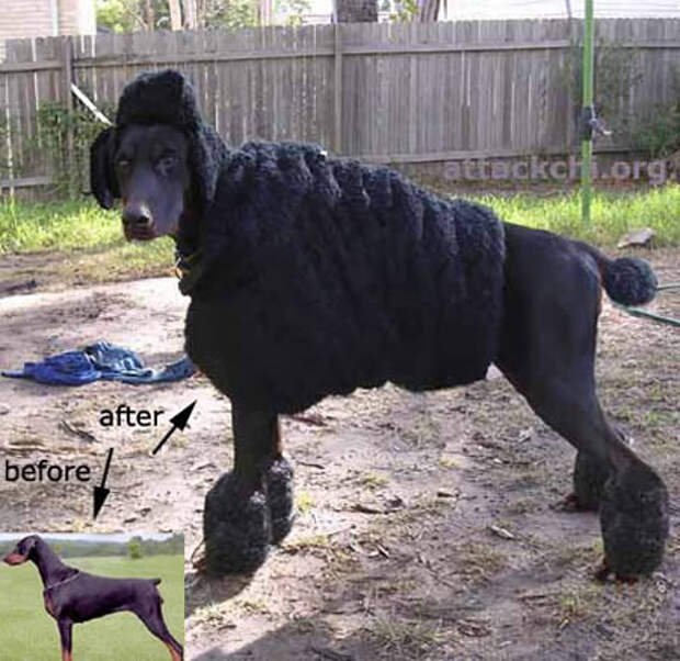 Вам иногда стыдно, что ваш пудель имеет кошачий нрав? Не стоит беспокоиться, просто сделайте ему стильную стрижку, замаскировав пса под представителя одной из так называемых опасных пород. К примеру, вы можете подстричь вашего любимца под добермана. Только будьте осторожны, вдруг подобная трансформация изменит нрав пса..)