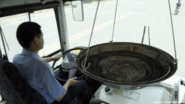 Одна из автобусных компаний Китая реализовала новый и необычный способ усмирять водителей лихачей с помощью большой чаши с водой, закреплёной в висячем положении рядом с местом водителя. Эта отличная рационализаторская идея появилась в китайском городе Чанша, в провинции Хуань. Согласно условиям компании, водители должны ездить так осторожно, чтобы к концу смены приехать в гараж с полной чашей и сухой кабиной, не расплескав в пути ни капли воды. А для того, чтобы водители не могли тайно подлить разлитую воду в чашу, в кабине установили камеры наблюдения.