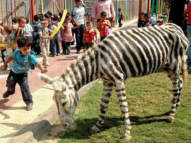 В Палестине, в Газе есть небольшой зоопарк, где однажды от голода погибли зебры, считавшиеся одними из его главных достопримечательностей. У администрации зоопарка не оказалось денег на то, чтобы заменить павших животных и они придумали необычное решение: нашли два белых осла и добавили в их окрас чёрные полосы. Полосатые животные с их длинными ушами, опущенной головой и сонными глазами теперь радуют палестинских детей. В недоумении осталась только львица…) Схожести с зебрами работники зоопарка добились с помощью малярного скотча и женской краски для волос.