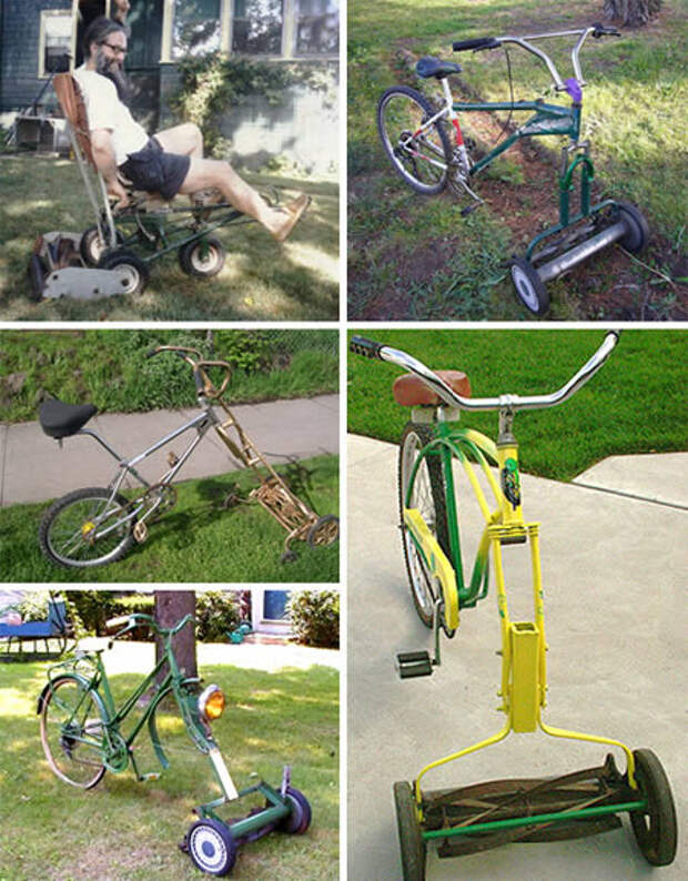 На самом деле на сегодняшний день появилось уже такое количество велосипедов, переделанных под газонокосилки, что их разнообразие наверняка достигло статуса феномена…)