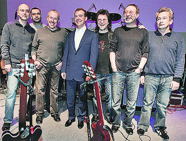 В 2010-м после памятного троллинга Путина Юрой-музыкантом (или наоборот) Андрейвадимыч во главе толпы придворных рокеров припёрся на приём к царю и не преминул тонко подколоть очкастого борца с попсой.