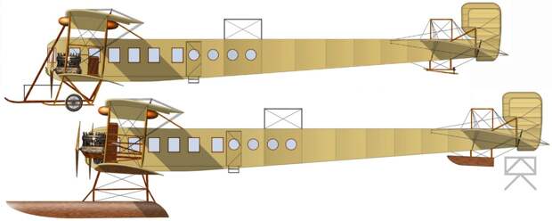 Первый экземпляр "Ильи Муромца" в его первоначальном виде и после переделки в гидросамолет.