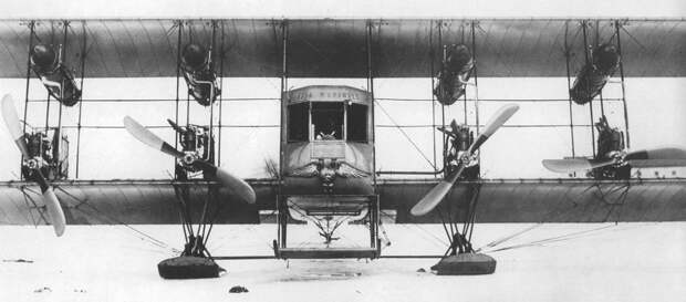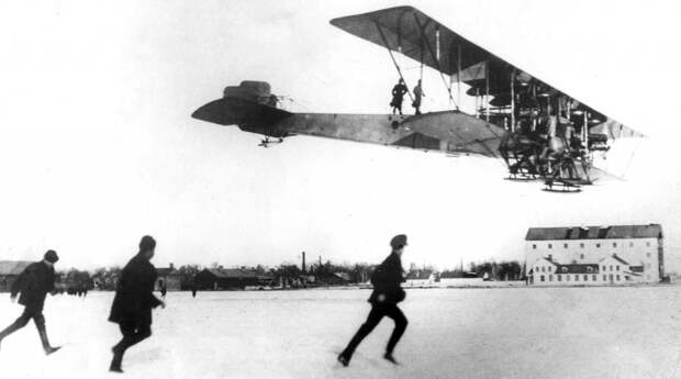 Одна из самых известных и зрелищных авиационных фотографий в мировой истории. "Илья Муромец" в испытательном полете, при этом двое пассажиров стоят на верхней обзорной площадке фюзеляжа. Относительно небольшая скорость, с которой летала эта машина (70-90 км/ч), позволяла им там находиться, держась за перила, без риска быть унесенными набегающим потоком воздуха.